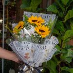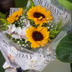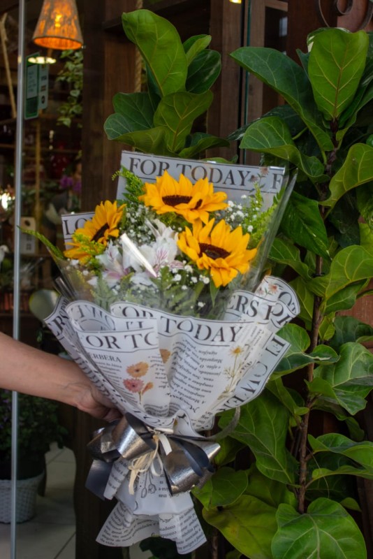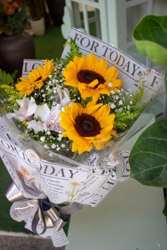 Buque com 3 girassol verdes e flores para acompanhamento embalagem com escrita sobre flores técnica de embalar diferenciada